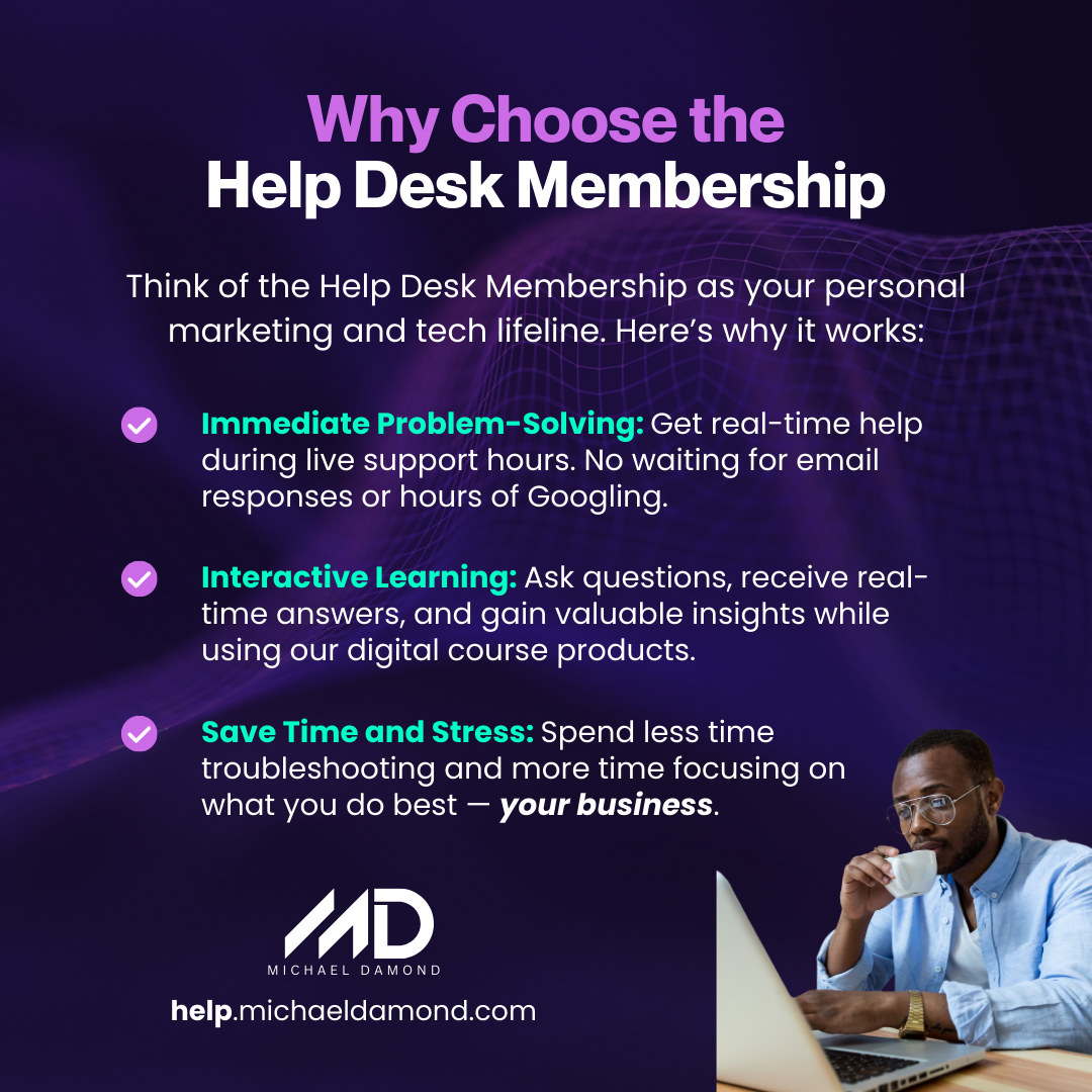 With the Help Desk Membership, you’ll have the support you need from our team of marketing and technology assistants to tackle challenges, improve your skills, and achieve your business goals.